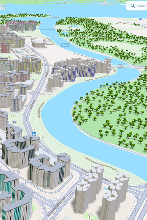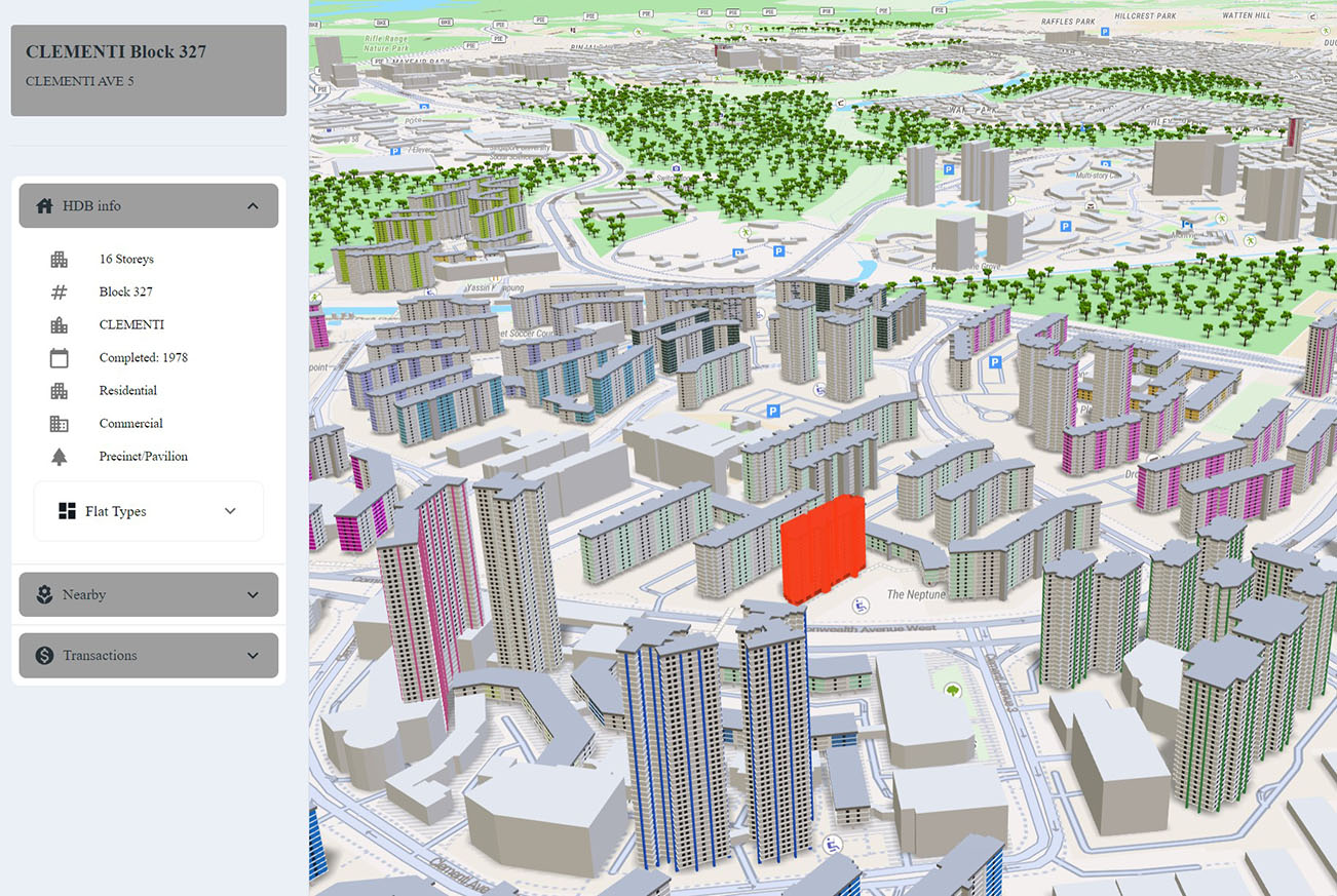 3D models of water, land areas, roads, and some buildings are created on-demand on the client's side using three.js. More visually detailed buildings, currently limited to HDBs, are generated offline through procedural modeling techniques from game development.